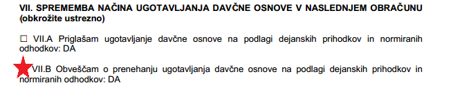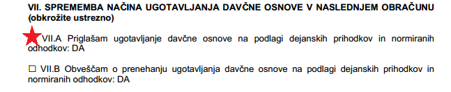 V prilogi št. 1 Obračuna akontacije dohodnine in dohodnine od dohodka iz dejavnosti v VII. poglavju mora zavezanec označiti VII. A, s čimer priglaša ugotavljanje davčne osnove na podlagi dejanskih prihodkov in odhodkov:
